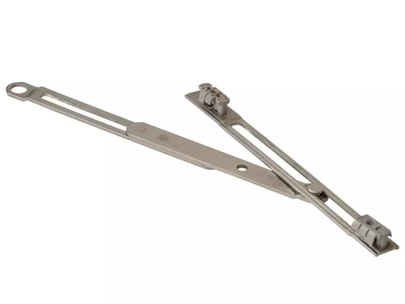 Ограничитель угла открывания окна от компании Roto с возможностью регулировки степени скольжения ножниц для предотвращения самопроизвольного захлопывания и открывания.